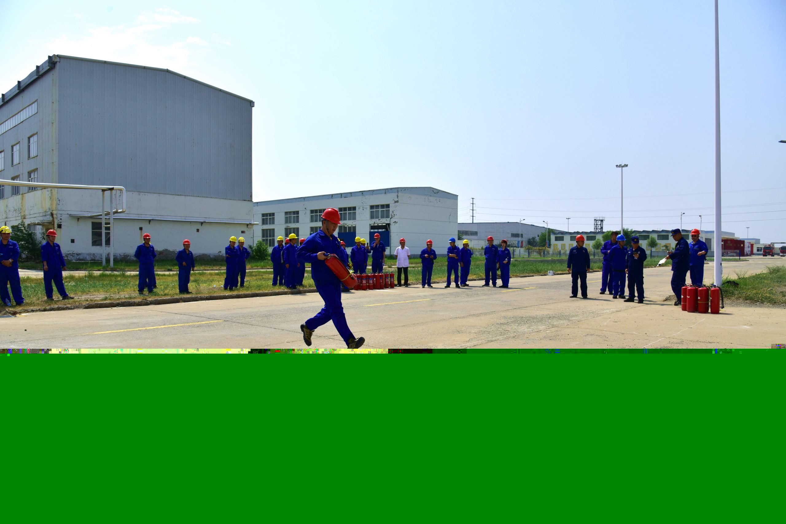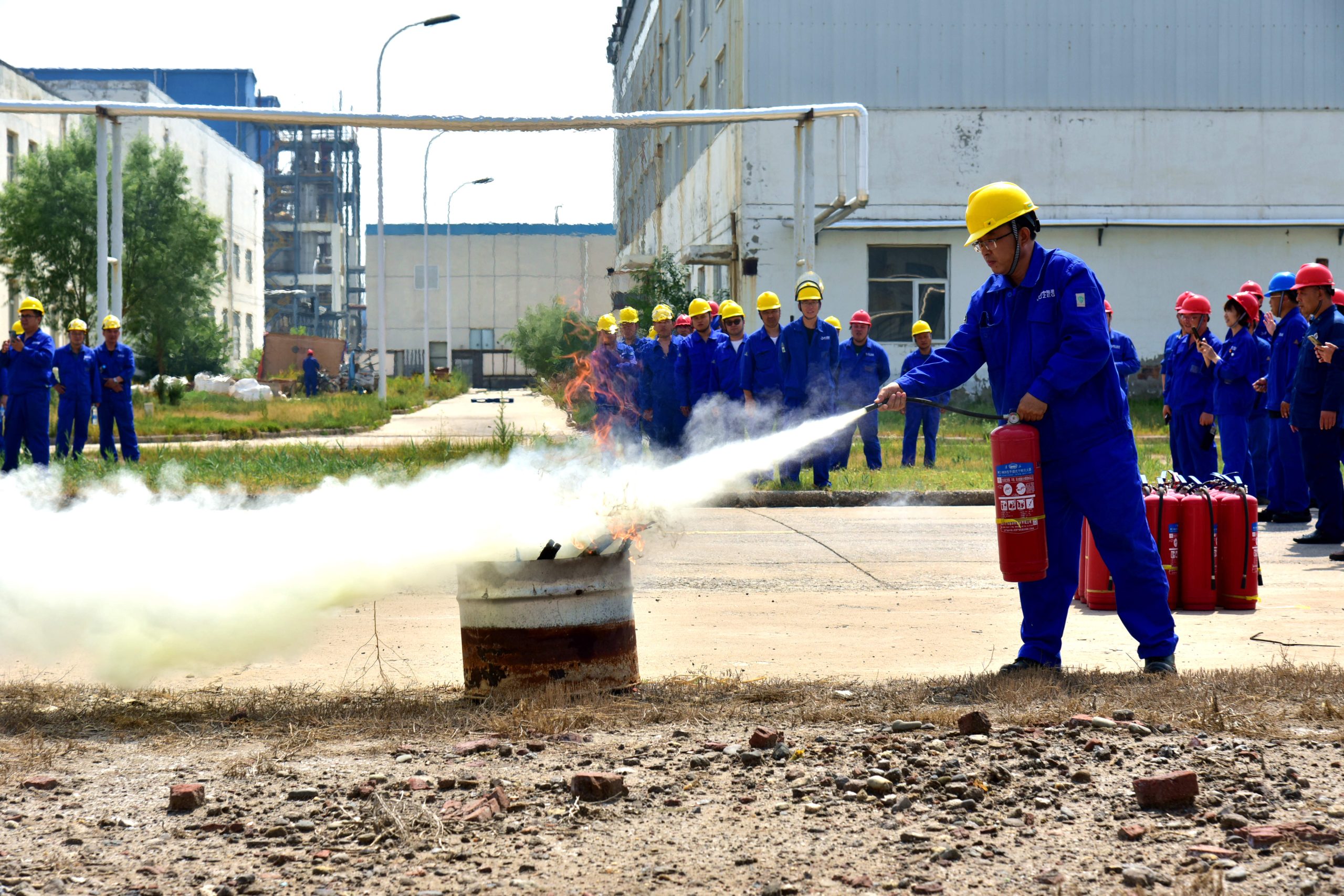 ? ? ? ? 比赛当日,全体参赛队员安全帽、工作服、劳保鞋穿戴整齐,精神饱满。在裁判长宣布比赛规则后,井然有序的按抽签号码列队逐一进行消防知识口试。“问,干粉式灭火器可用于哪些类型的火灾扑救?”“答,干粉式灭火器可用于可燃固体、可燃液体、可燃气体、电气着火等火灾扑救,因为干粉是不导电的,可以用于扑救带电设备火灾。回答完毕。”“回答正确!”进行答题的参赛队员充满自信,看得出对消防基础知识掌握的十分扎实。在随后现场实操环节,参赛队员按照灭火器使用要领,手提干粉式灭火器迅速奔赴着火点上风向几米处,颠倒摇动灭火器,拔出保险销,手持胶管颈部,对准火焰根部由近及远进行喷射,并左右扫射,压制火焰防止窜回,直至火焰熄灭。整个灭火过程用时只有几秒钟时间,动作干净利索,显示了自身消防技能的专业与熟练!